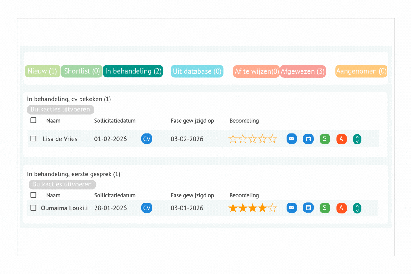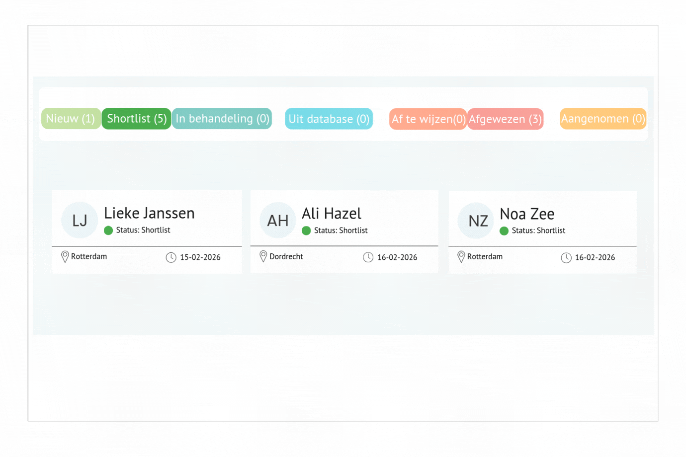 Volg het sollicitatieproces overzichtelijk via een heldere funnel. Zie in één oogopslag waar elke kandidaat zich bevindt en wat de volgende stap is. Zo weet jij – en je collega’s – altijd wat er speelt. Geen eindeloos zoeken of schakelen, maar een gestructureerde aanpak die iedereen direct overzicht biedt.
